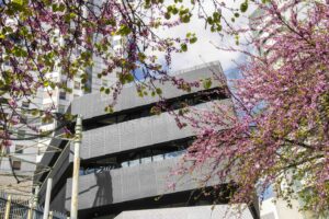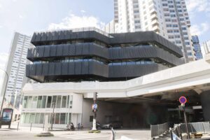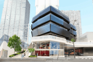 Le bâtiment a été clairement détaché de la dalle, par un traitement entièrement vitré des façades en rez-de-dalle, et dont le périmètre à la forme simplifiée met en évidence l’idée de la taille de guêpe tout en réduisant les recoins. »