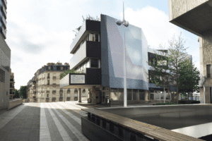 Le bâtiment au-dessus de la dalle a été tout d’abord remodelé. Sa nouvelle volumétrie est simplifiée par la suppression de certaines jardinières, de la création de nouveaux alignements de façades. Ce travail libère des axes de perspectives plus francs depuis la dalle vers la rue et inversement.